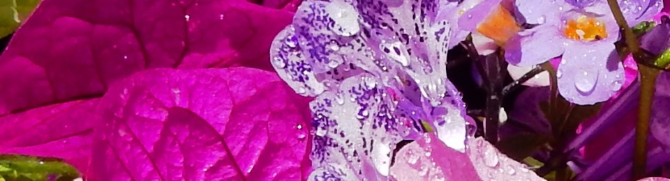 Bougainvillaeas are ‘dressed to the nines’ in their brilliant pink, mauve and amaranthine splendour; it will be a month or two before fragrant lilac trusses adorn the Wisteria.