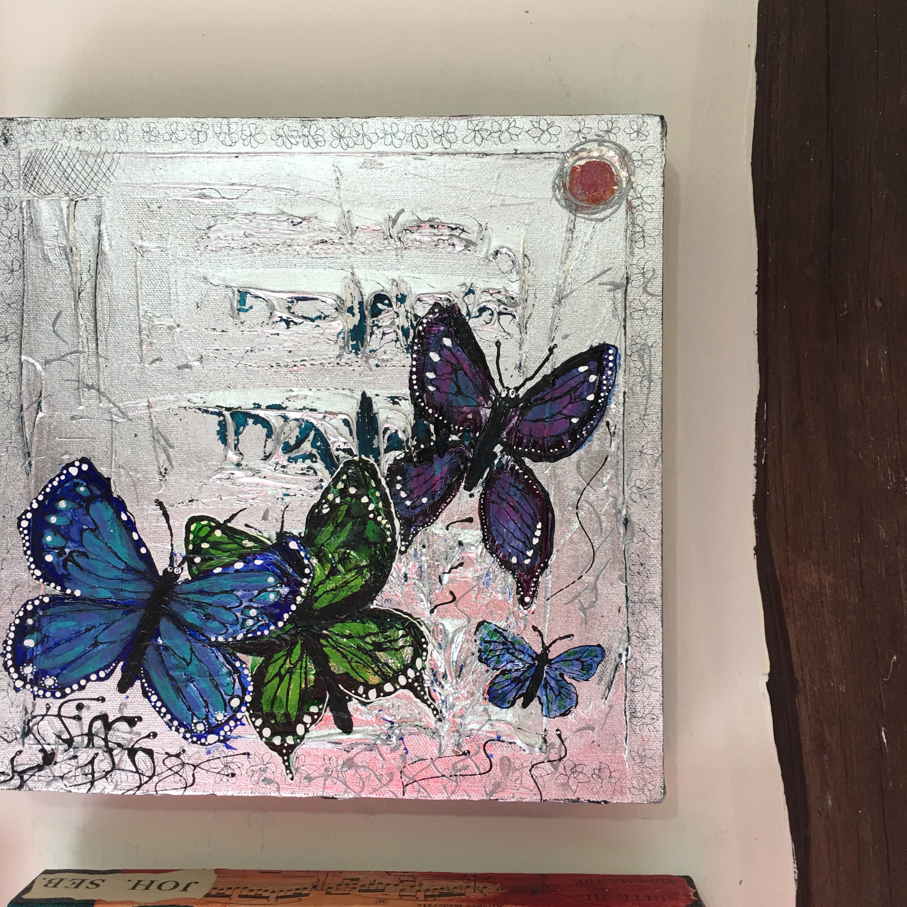 Karin starts a painting by texturizing the surface with a thick moulding compound. Her methods of painting include: Applying thick layers of acrylic or glass paint on the canvas in vibrant colours, in an impasto style and then spontaneously dabbing, or sponging back the surface.She not only uses traditional artist paintbrushes but also feathers, sticks and whatever comes to that could assist the creating process. She often uses the ‘sgraffito’ technique, scratching the surface of the painting with carving tools. One painting could have up to 20 layers of an image upon image.